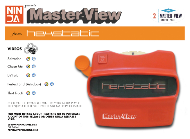 Uber VJs Hexstatic's DVD album Master-View is classic Hex stuff: vintage video game porn, dog-killing cartoon ninjas, sixties future psyche, giant teddy bears, dancing gadget catalogues, pretty coloured circles. Oh, and some damn fine electro music too.