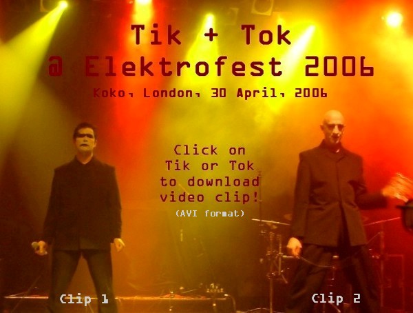 80s cult icons Tik + Tok exploded onto the global music scene as part of Shock, creating sublime robotic disco like the brilliant "Dynamo Beat". As Tik + Tok they only ever released one album, 1984's "Intolerance". After 21 years in the wilderness, the dynamic duo returned to the UK live circuit at this year's Elektrofest. DSO was there to capture that landmark moment for you. (Warning! These are large files sizes - both around 15MB a piece).